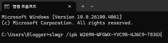 예시 : slmgr /ipk W269N-WFGWX-YVC9B-4J6C9-T83GX