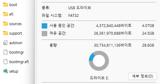 사용 중인 공간은 4.07GB로 확인되며, Autorun 및 Setup 파일 등의 설치 프로그램이 USB에 담긴다. 이제 이 USB를 이용해 윈도우를 설치하려는 컴퓨터에 연결한 뒤 설치를 진행하면 된다.