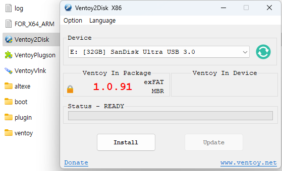 압축해제된 Ventoy 폴더에서, Ventoy2Disk 파일을 실행한다. 그리고 디스크를 선택한 후 인스톨을 누른다.