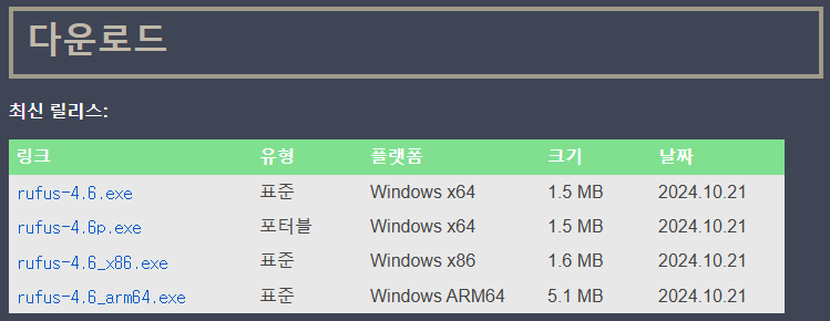루퍼스(Rufus) 홈페이지에서 최신 버전의 Rufus를 다운로드한다. 맨 위에 거 받으면 된다.