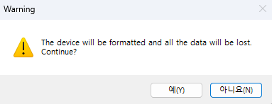 해당 드라이브의 데이터가 지워질 수 있다는 경고가 두 번 뜨고, 모두 예를 누르면 USB가 Ventoy로 세팅된다.