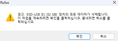 경고 문구가 뜬다. 설치 USB를 만들려는 드라이브에 필요한 자료가 있다면 백업을 해 두고, 지워져도 문제없다면 확인을 눌러 진행한다.