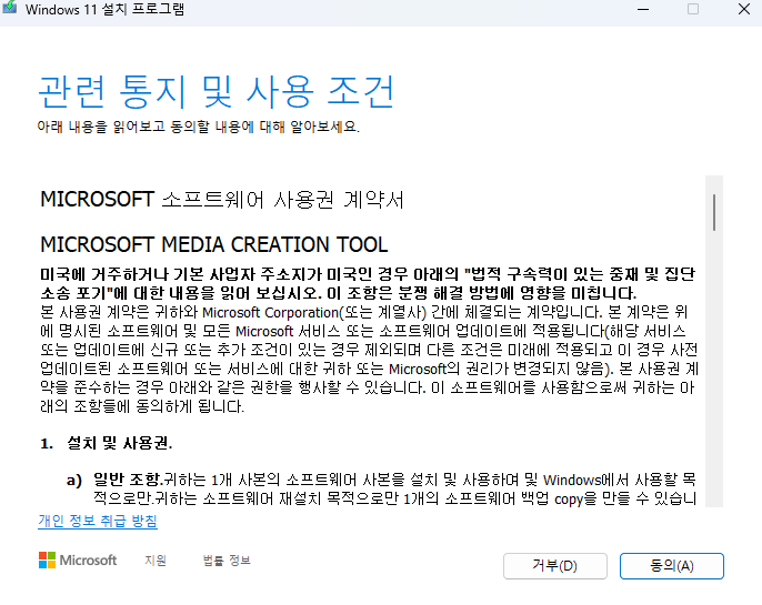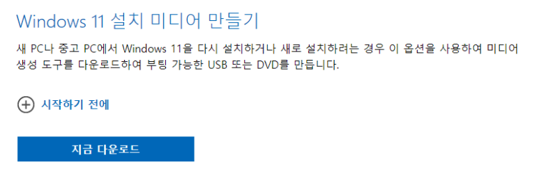 - 윈도우즈 11 설치 미디어를 다운 받는다.