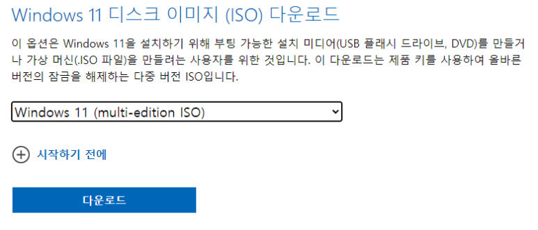 MS 공식 홈페이지에서 Windows 11 디스크 이미지 (ISO) 다운로드에서 다운로드 선택을 눌러 Windows 11 (multi-edition ISO)를 선택하고 다운로드를 누른다.