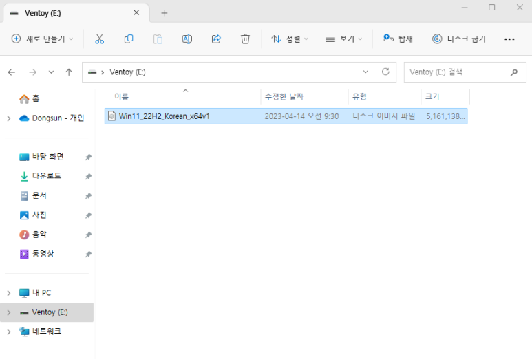 4. Ventoy로 세팅된 USB에 윈도우 설치 ISO 파일을 옮긴다.