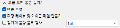 이제 시작을 누르면 되는데, 만약 2009년 이전의 구형 PC에 윈도우를 설치하려는 경우 파티션 구성을 GPT가 아닌 MBR로 바꿔주고, 오래된 USB라 불량이 의심된다면, 고급 포맷 옵션 표시를 누른 뒤 '장치의 불량 블록 검사'를 체크해 둔다.