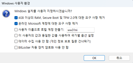 다만, 종종 USB 제작 중 에러가 발생하는 경우 또는 윈도우 설치 중 중간에 마이크로소프트 계정 로그인 요구를 없애는 등의 옵션을 추가, 필수 조건인 TPM 2.0을 무시하고 설치하고 싶은 경우 Rufus 프로그램을 사용할 수 있다.