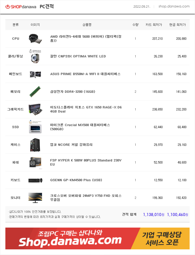 이 견적에서 고려해야 될 부분은 라이젠 5600 CPU가 제법 나중에 나온 CPU라 메인보드 바이오스 업데이트를 해야 인식할 가능성이 있고, 그래픽 카드 포트와 모니터에서 기본으로 주는 연결 선이 다를 경우 별도 구매해야 할 수 있으며, 듀얼 모니터 구성 제대로 쓰려면 모니터 암을 별도로 구매할 필요가 있다는 점 정도.