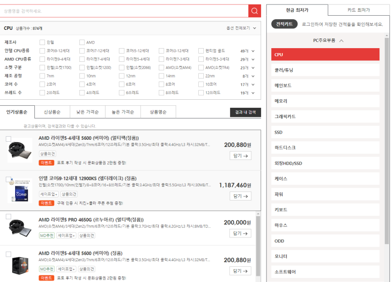 우측의 CPU / 쿨러 / 메인보드 등의 항목을 누르면 거기에 맞는 부품들이 왼쪽에 리스트 업되고, 이걸로 직접 컴퓨터 부품 구성을 해 보고 견적을 낼 수 있다.