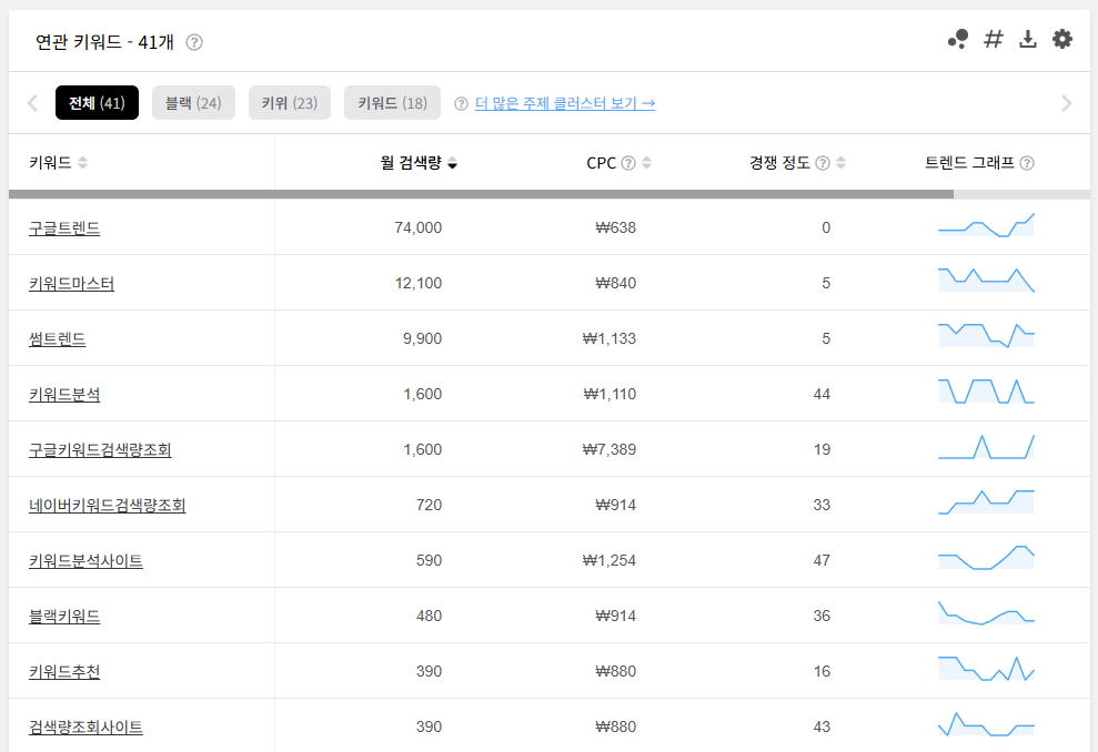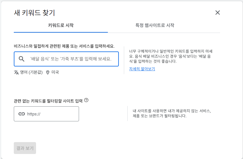 새 키워드 찾기를 누르면 위와 같은 창이 뜨는데, 여기서 미국을 클릭해 대한민국으로 바꾸고, 영어 대신 한국어로 바꾼 뒤 키워드를 넣어 검색하면 제대로 된 결과가 나온다.