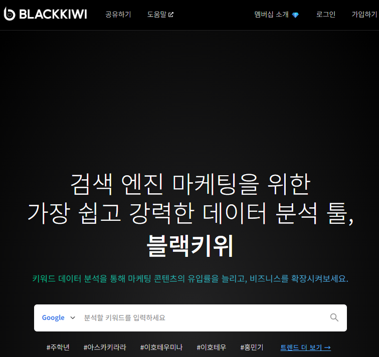 블랙키위는 네이버 검색량 도구로 시작했으나, 구글 검색량 측정도 도입되었다. 네이버 검색량의 경우 다소 제약이 있는 무료로 사용할 수 있으나 구글 검색량 서비스의 경우 유료 플랜에서 사용 가능.