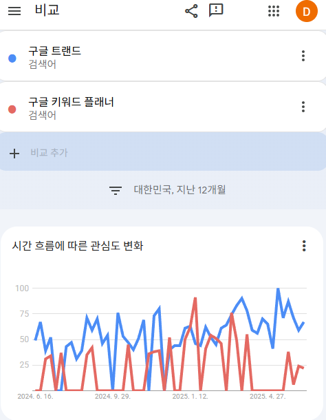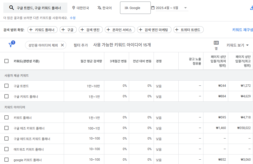 구글 키워드 플래너 2024년 6월 ~ 2025년 5월 검색량 평균 순위 (대한민국)