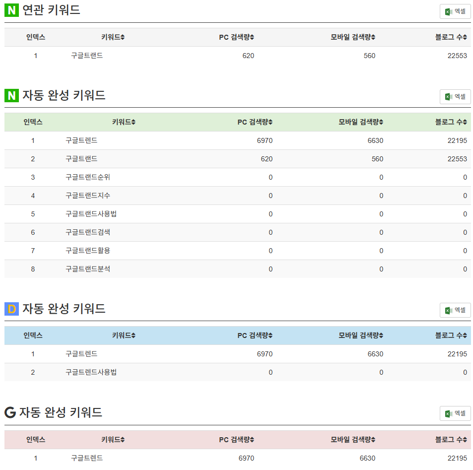 키워드를 넣으면 구글 연관 검색어 데이터를 제공하지만, 검색량은 네이버 검색량이 출력된다.
