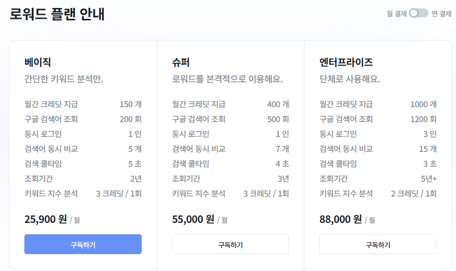 | 로워드 | 1,000 ~ 10,000 | 월 25,900원 (기본 플랜) |