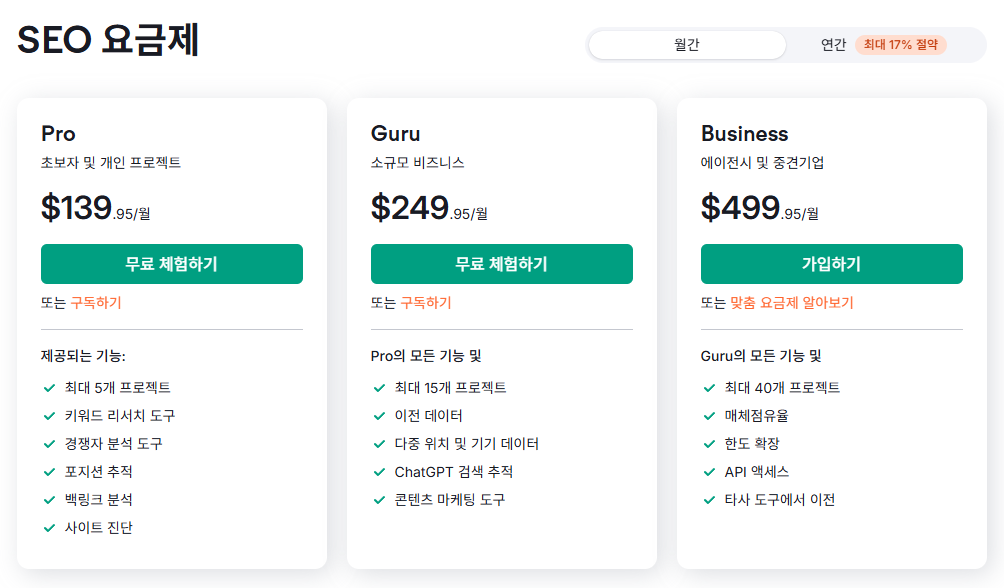 기본적으로 유료 사이트이며, 키워드 리서치 도구를 사용하기 위한 가격은 상당히 높은 편.