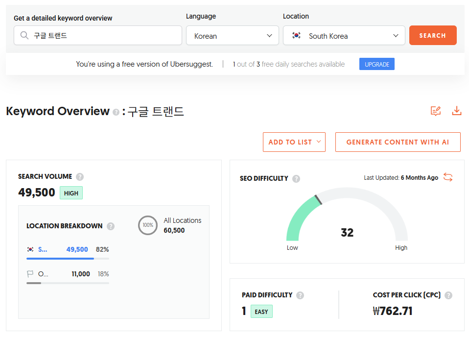 별다른 기능은 없으나, 구글 검색량을 별다른 설정 없이 바로 보여주며, 네이버 검색량도 같이 보여준다.