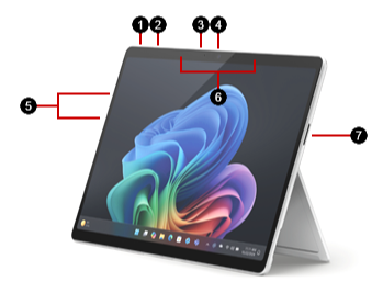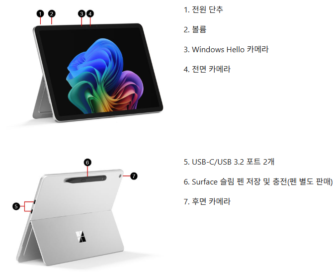 | 포트 및 충전 | 다음 작업/연결을 지원하는 USB-C®/USB4® 포트 2개: 충전 데이터 전송 DisplayPort 1.4a Surface Thunderbolt™ 4 도크 및 기타 액세서리 65W이상의 전원 공급 장치 사용 시 Surface Connect 또는 USB-C®를 통한 고속 충전 지원 Surface Pro 키보드 포트 Surface Connect 포트 NanoSIM |