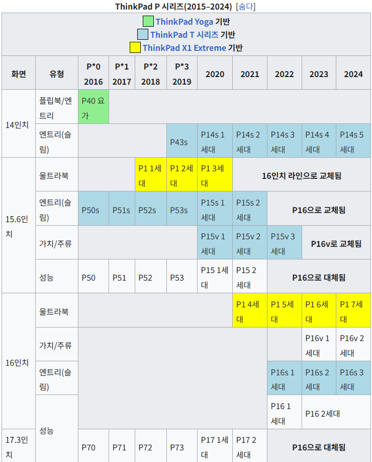 원래 17 / 15인치 모델이 있었는데 16인치로 통합되었고, P 모델은 T 시리즈 기반, P1 모델은 X 시리즈 기반의 성능 강화판으로 볼 수 있다. 메인 시리즈는 P16v, 최고 성능 옵션이 있는 모델은 P16이다.
